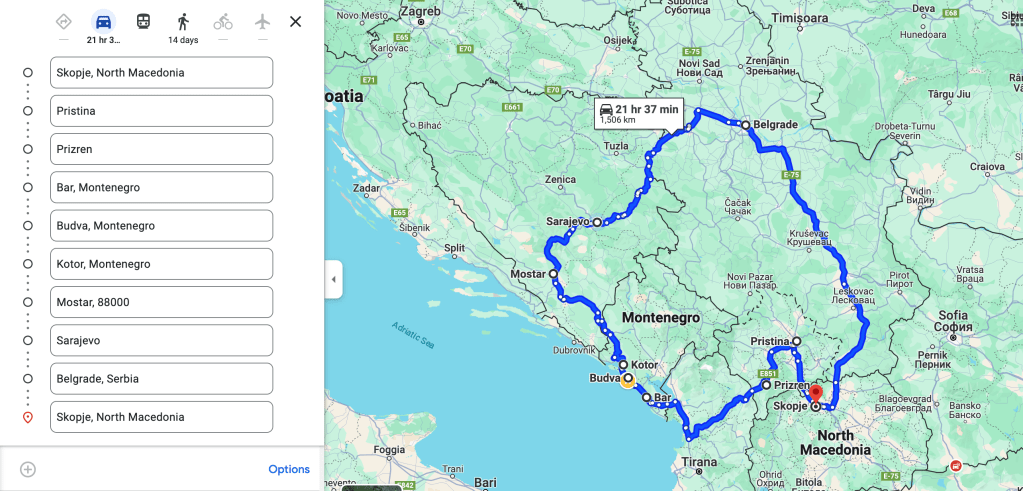 Bu kadar kapsamlı bir gezi için vakti veya imkanı olmayanlar, Balkanları iki ayrı zamanda iki ayrı rota olarak planlayabilir. 1. gezide Saraybosna ve Karadağ, 2. gezide ise Makedonya ve Kosova gezilebilir. 3-4 günlük iki sefer halinde gayet makul bir rota. Denemek isterdim.