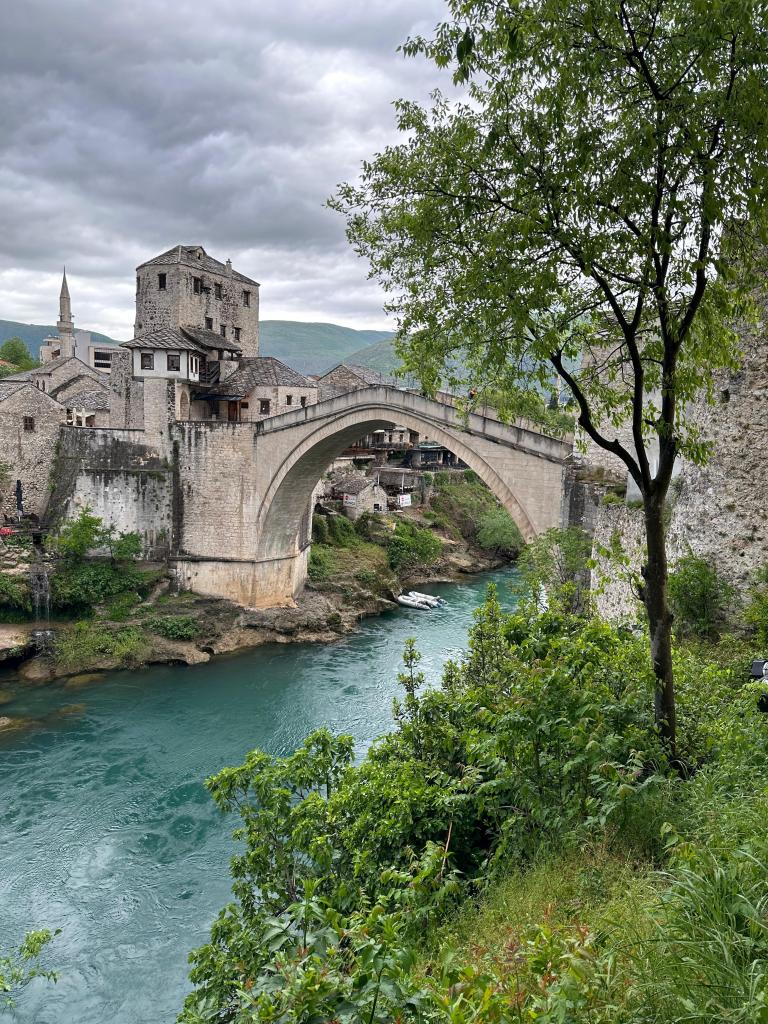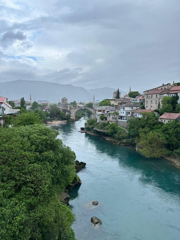 Mostar’a vardığımızda hava sıcaklığı 10 derece birden düştü. Sağanak yağmurla şehre merhaba dedik. Bir gün önce Karadağ’da tişörtle gezerken, burada montlarımızla üşüdük. Mostar ve Saraybosna Kuzey’de kaldığı ve dağlar tarafından Akdeniz ikliminden ayrıldığı için ciddi bir hava farkı var. Bu yüzden hazırlıklı gelinmeli. Saraybosna’da bizi kar karşıladı zaten.