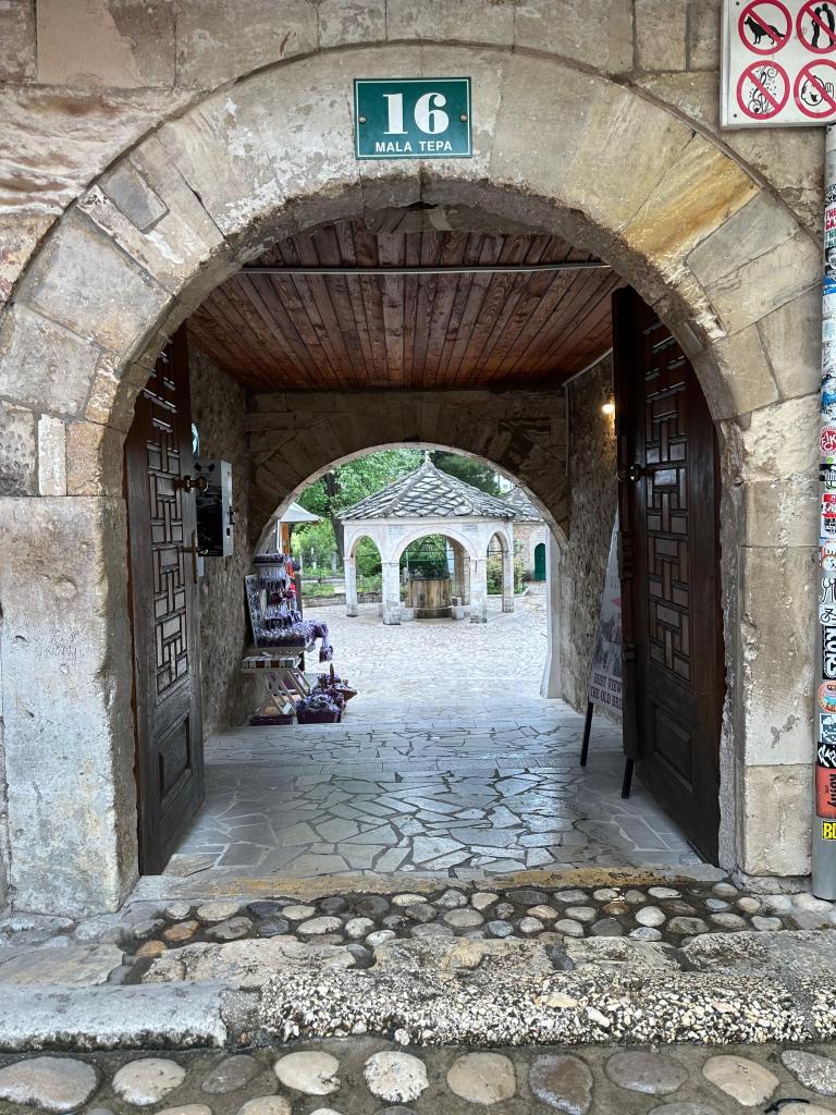 Köprüyü dört bir ayağından temaşa etmek mümkün. 1. Yunus Emre Enstitüsü’nün bahçesinden. Karagözbey Medresesi’nin tarihi binasında hizmet veren enstitüye bir uğrayalım dedik. Çok sıcak kanlı boşnak bir hanımefendi bizi karşıladı ve çay ikram etti. Ardından enstitünün arkasındaki bahçeye bizi çıkardı ve ora biraz vakit geçirip fotoğraf çekmemize/çekinmemize müsaade etti sağolsun. Bir an istemsiz bir biçimde Boşnak olup o medresede Türkçe öğrenme isteği geldi içime ne yalan söyleyeyim.