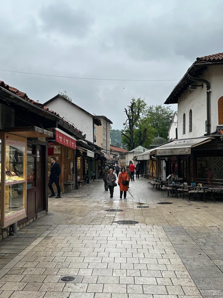 Saraybosna’yı bir şehir olarak inşa edenler zaten Osmanlılar olduğu için Başçarşı ve civarı tam bir Osmanlı şehri. Başçarşı’yı adımlarken herhangi bir Anadolu şehrinin çarşısında geziyormuş hissi tüm bünyenizi sarıyor. 19. Yüzyılın son çeyreğine kadar Osmanlı hakimiyetinde kalan şehir Avusturya-Macaristan İmparatorluğu hakimiyetine girince modern Avrupa mimarisi baskın gelmeye başlamış. Bu ayrımı simgelemek için Başçarşı’nın başladığı noktada zeminde bir işaret bile bulunuyor. İşaretin ötesi bir Avrupa, sonrası ise bir Osmanlı şehri. Benzer bir ayırma görevini Üsküp’te Vardar Nehri üstleniyordu.