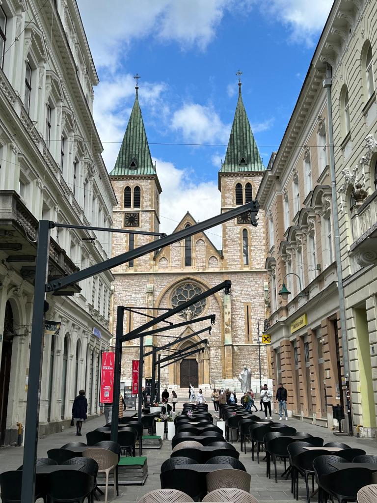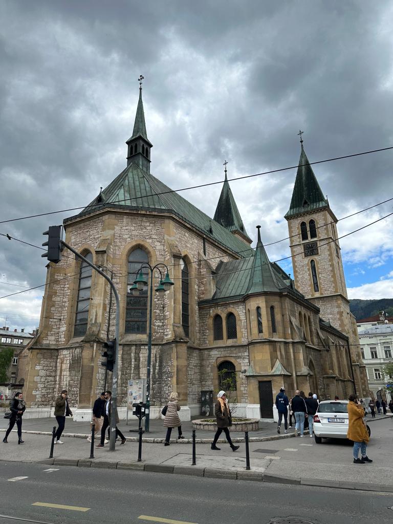 Turumuz, Başçarşı’ya Batı yönünden girişte yer alan İsa’nın Kutsal Kalbi Katedrali’nde (The Cathedral of Jesus’ Sacred Heart) son buldu. Devasa bir yapıya sahip bu katedralin tarihi her ne kadar Gotik mimarisiyle ortçağ havası verse de aslında çok eskiye gitmiyor. Nitekim 1889’da inşa edilmiş. İlginç bir inşa hikayesi var. Malum Osmanlı fethettiği yerlerde gayri müslimlerin camilerden büyük ve yüksek mabetler inşa etmelerine izin vermezdi. Avusturya-Macaristan İmparatorluğu Bosna’yı ele geçirince çarşıyı ve Osmanlı eserlerini gölgede bırakacak bir katedral yaptırmak ister. Hıristiyan din adamlarını toplarlar ve talimat verirler. Fakat asırlardır küçük kilise yapmaya alışmış Bosnalı Hıristiyanlar bu işin üstesinden gelemeyeceklerini ifade edip geri çekilmişler. Nihayet o vakitlerde Saraybosna’da bulunan Josip Vancas isimli Macar bir mimar bu işi üstlenmiş ve katedral inşa edilmiş.