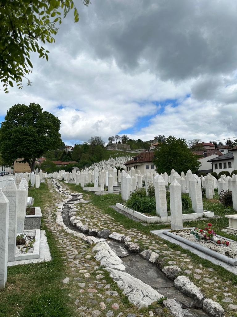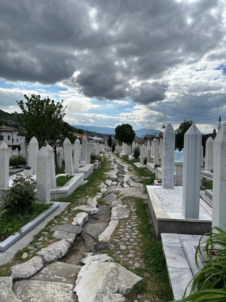 Kütüphaneden sonra Bilge Kral Aliya’yı ziyarete gittik. Aliya’nın kabir Kovaçiç Şehitliği’nde yer alıyor. Su Sebili’nin arkasında yoldan yukarı çıkarak 5 dakika yürümeyle şehitliğe ulaşıyorsunuz. Aliya’nın yanısıra Bosna Savaşı’nda ölen 5 bin askerin 1500’ü burada medfun. Aliya’nın kabri şehitliğin orta kısmında yer alıyor.